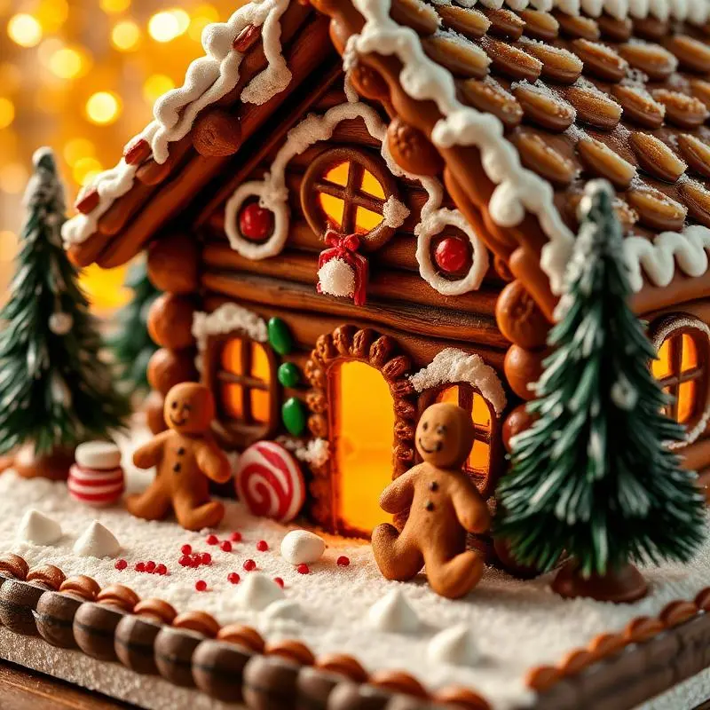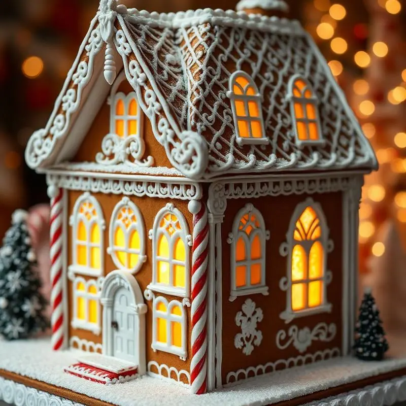 A charming traditional gingerbread house with snow-dusted roof, candy cane trim, and gumdrop landscaping